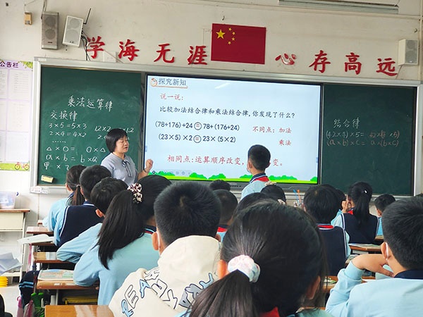 首先,由坦洲鎮(zhèn)永一小學(xué)的晏黎老師呈現(xiàn)四年級(jí)課例《乘法交換律和結(jié)合律》。在課堂上,晏老師大膽的引導(dǎo)學(xué)生,根據(jù)已經(jīng)學(xué)過(guò)的加法交換律和結(jié)合律,對(duì)乘法交換律和結(jié)合律進(jìn)行猜想和驗(yàn)證,把課堂交給學(xué)生。在探索的過(guò)程中,晏老師層層遞進(jìn),對(duì)比分析,抓住課堂生成資源,充分利用學(xué)生探索過(guò)程中出錯(cuò)的地方予以解析,逐步帶領(lǐng)學(xué)生由錯(cuò)轉(zhuǎn)對(duì),由一知半解到透徹領(lǐng)悟。
