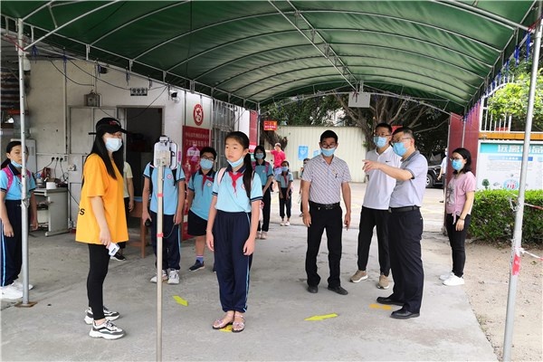 一大早,返校心情雀躍的學(xué)生按照學(xué)校提前下發(fā)的溫馨提示,錯(cuò)峰來(lái)到學(xué)校門(mén)口,在老師及安保人員的指引下,有序并保持間隔地在學(xué)校門(mén)口進(jìn)行掃臉測(cè)溫,順利進(jìn)入學(xué)校。坦洲鎮(zhèn)黨委委員坦洲公安分局局長(zhǎng)劉世堅(jiān)、坦洲鎮(zhèn)教育事務(wù)指導(dǎo)中心專干張凱在旁邊耐心陪同,不時(shí)與裕洲小學(xué)校長(zhǎng)郭金棠交流意見(jiàn)和建議,為學(xué)生重新適應(yīng)校園生活提供了保障。