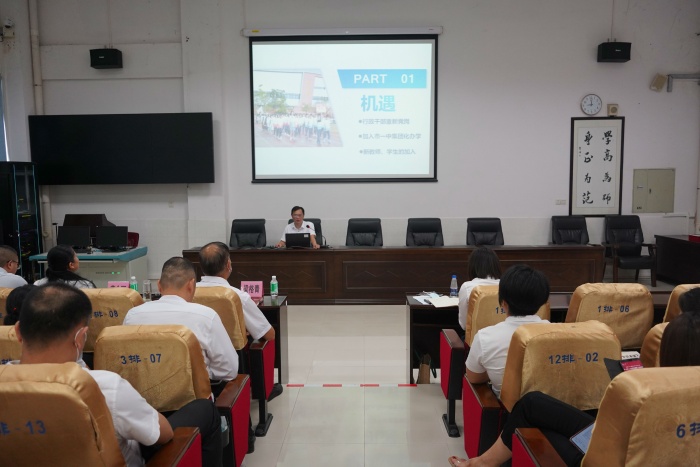黃金麗副校長(zhǎng)首先歡迎全體教師返校,表明了對(duì)學(xué)校加入集團(tuán)化辦學(xué)后的發(fā)展期待。隨后進(jìn)行大會(huì)的第一項(xiàng)議程,由中山市第一中學(xué)教育集團(tuán)坦洲中學(xué)黨總支書記梁格青書記發(fā)表講話。梁書記先向全體教師分享了集團(tuán)化辦學(xué)的優(yōu)勢(shì),鼓勵(lì)老師們把握機(jī)遇提升個(gè)人技能,進(jìn)行專業(yè)發(fā)展;然后解釋了坦洲鎮(zhèn)公辦中小學(xué)中層干部人事變動(dòng)事宜,號(hào)召全體教師團(tuán)結(jié)在新的領(lǐng)導(dǎo)班子周圍,辦人民更滿意的教育。