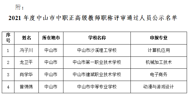 附:2021年度中山市中職正高級教師職稱評審?fù)ㄟ^人員公示名單