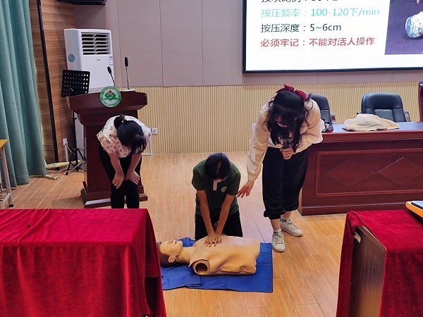 梁醫(yī)生從孩子們經(jīng)常遇到的鼻子出血這個(gè)事例講起,“怎樣才能正確止血?”,這一問題激發(fā)了同學(xué)們的興趣,大家踴躍發(fā)言,很快就進(jìn)入了學(xué)習(xí)狀態(tài)。梁醫(yī)生針對同學(xué)們的回答與問題,結(jié)合PPT示范,逐一講解。在培訓(xùn)中,梁醫(yī)生重點(diǎn)介紹了心肺復(fù)蘇的操作步驟及如何正確使用自動(dòng)體外除顫儀(AED),包括判斷環(huán)境、判斷最佳救助時(shí)間、判斷呼吸和意識、呼救求助、調(diào)整病人體位、胸外按壓、人工呼吸等急救知識。梁醫(yī)生利用人型模具,現(xiàn)場傳授同學(xué)們心肺復(fù)蘇的相關(guān)知識,細(xì)致耐心地講解并示范每個(gè)急救的步驟和注意事項(xiàng)。通俗易懂、生動(dòng)有趣的授課方式受到了同學(xué)們的熱烈歡迎,現(xiàn)場氣氛十分活躍。