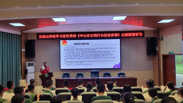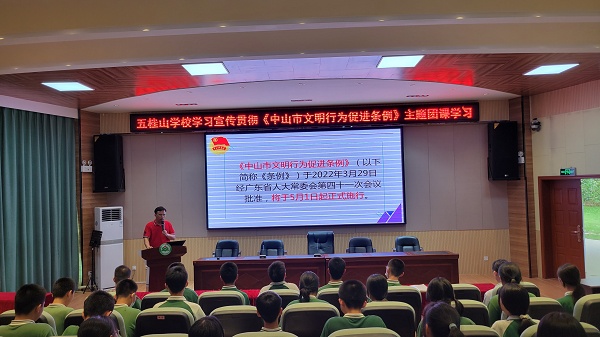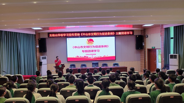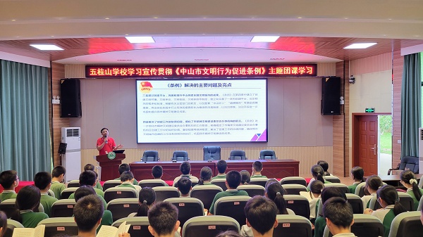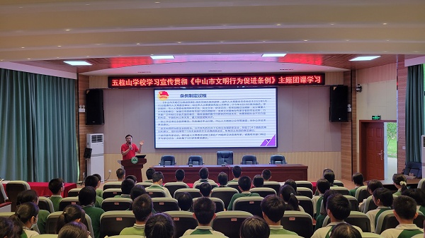 為學(xué)習(xí)宣傳和落實(shí)《中山市文明行為促進(jìn)條例》實(shí)施方案,提升廣大青年學(xué)生的文明意識(shí)和文明素養(yǎng),規(guī)范促進(jìn)其文明行為,踐行社會(huì)主義核心價(jià)值觀,助力文明城市建設(shè),2022年5月26日。五桂山學(xué)校團(tuán)委在學(xué)校綜合報(bào)告廳開(kāi)展了以“文明學(xué)習(xí)我?guī)ь^ 踐行新時(shí)代文明”為主題的《中山市文明行為促進(jìn)條例》主題團(tuán)課學(xué)習(xí)。團(tuán)課學(xué)習(xí)由五桂山學(xué)校團(tuán)委書記馮銳強(qiáng)主講,全體團(tuán)員、團(tuán)校學(xué)員、少先隊(duì)干部共70多人參加了本次學(xué)習(xí)。