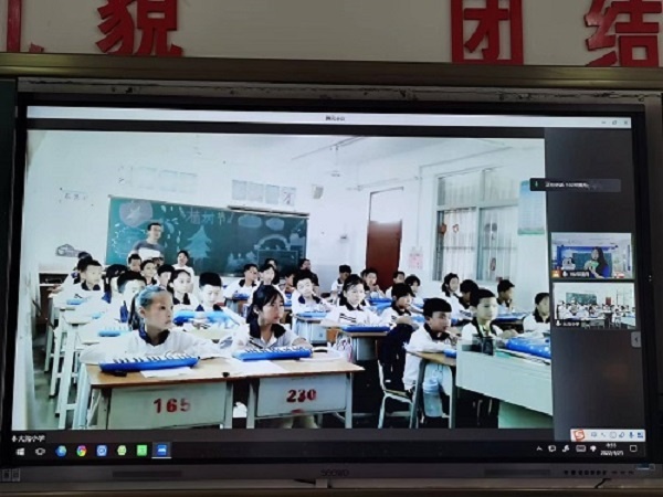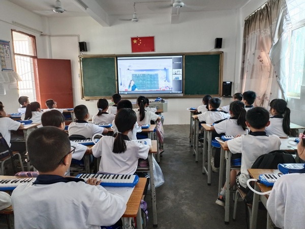 一根網(wǎng)線,一塊屏幕,將相距四百多公里的兩校師生緊緊連在一起。姚敏鳳老師的口風(fēng)琴課教同學(xué)們認(rèn)識(shí)口風(fēng)琴、學(xué)做手指操、學(xué)習(xí)手型、認(rèn)識(shí)鍵盤、學(xué)習(xí)呼吸并且學(xué)習(xí)吹奏歌曲《搖啊搖》。潘玉迪老師的《吃瓜果的人》美術(shù)課,深深吸引了大溝小學(xué)二年級(jí)的同學(xué)們,用欣賞小朋友吃瓜果的表情視頻進(jìn)行課堂導(dǎo)入,通過講解知識(shí)點(diǎn)、微課講解繪畫步驟及教師示范教同學(xué)們畫吃瓜果的人。兩節(jié)藝術(shù)課帶給大溝小學(xué)的同學(xué)們以別開生面的體驗(yàn),孩子們興趣盎然、樂在其中。