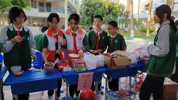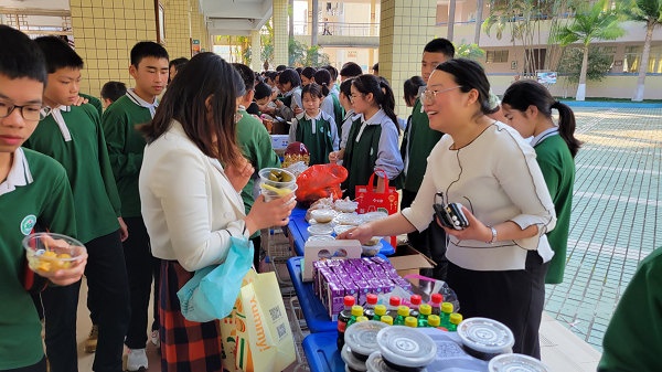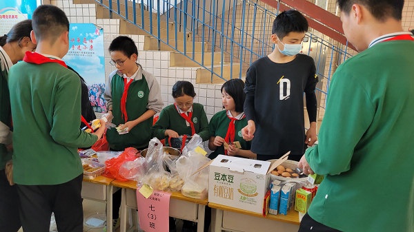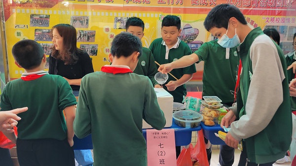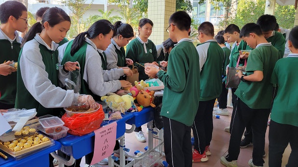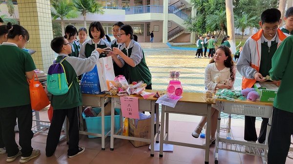 義賣活動在《愛的奉獻》歌聲中拉開了序幕,此時此起彼伏的義賣叫喊聲充滿了整個校園,愛心涌動的五桂山學子忙得不可開交。各班的“推銷員”積極叫賣,各想奇招,“推銷”自己班的義賣品,甚至還“出門”宣傳,一批又一批的老師和學生被吸引前來觀看與捐助;“收銀員”忙著收取與整理義賣款;“登記員”忙著寫出售記錄,填寫《五桂山學校愛心義賣出售登記表》,對購買人和每件物品的出售情況做好記錄;“淘客”忙于挑選心儀的“商品”,奉獻愛心。各班義賣攤位的“生意”異?;鸨芏嗔x賣品被搶購一空,真可謂“愛心涌動三月校園,赤子情滿五桂山學?!?。