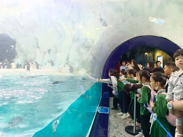 大約一個(gè)小時(shí)的車程,學(xué)生們終于到達(dá)向往已久的海洋王國(guó)。懷著迫切的心情,同學(xué)們整齊有序排隊(duì)入園。走進(jìn)園區(qū),同學(xué)們與動(dòng)物明星們親密接觸,耐心傾聽工作人員介紹,認(rèn)真觀察了解動(dòng)物朋友的秘密。瞧!在動(dòng)人的音樂伴奏和訓(xùn)練員的指導(dǎo)下,可愛的白鯨在水中做出跳躍和360度旋轉(zhuǎn)等高難度動(dòng)作,體態(tài)優(yōu)美如水中芭蕾,場(chǎng)館內(nèi)不時(shí)傳來熱烈的掌聲和陣陣歡呼聲。在企鵝館內(nèi),同學(xué)們發(fā)現(xiàn)企鵝們?cè)谘┑厣蟿?dòng)作緩慢笨拙,可是當(dāng)它們一躍入水中,動(dòng)作就會(huì)快如閃電,在水中劃出一道道潛行軌跡!同學(xué)們穿梭在各個(gè)海洋動(dòng)物的館舍,收獲滿滿。在各類游戲項(xiàng)目中,同學(xué)們體驗(yàn)了極致的歡樂與刺激,他們?cè)趨群奥曋袕?qiáng)身健體,在尖叫聲中錘煉意志。
