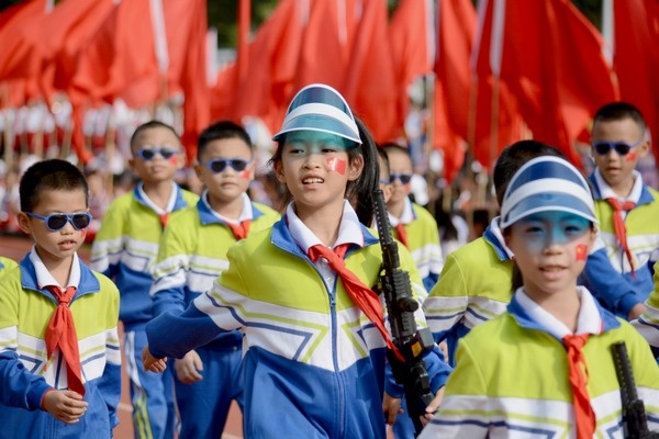 8:30入場式正式開始。首先進場的是五六年級學生組成的強國方陣,這是一個近千面紅旗組成的方陣。同學們擎著紅旗,小步奔跑進場,千面紅旗就像紅色潮水一般浩浩蕩蕩漫滿整個操場。金秋風動,樂曲悠揚,紅浪翻涌,蔚為壯觀。