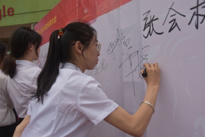 在學校主要領導和初中部全體教師的帶領下,同學們鄭重地在宣誓橫幅上簽下了自己的名字,用實際行動實踐著許下的諾言。