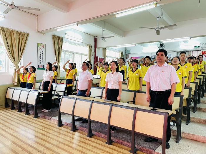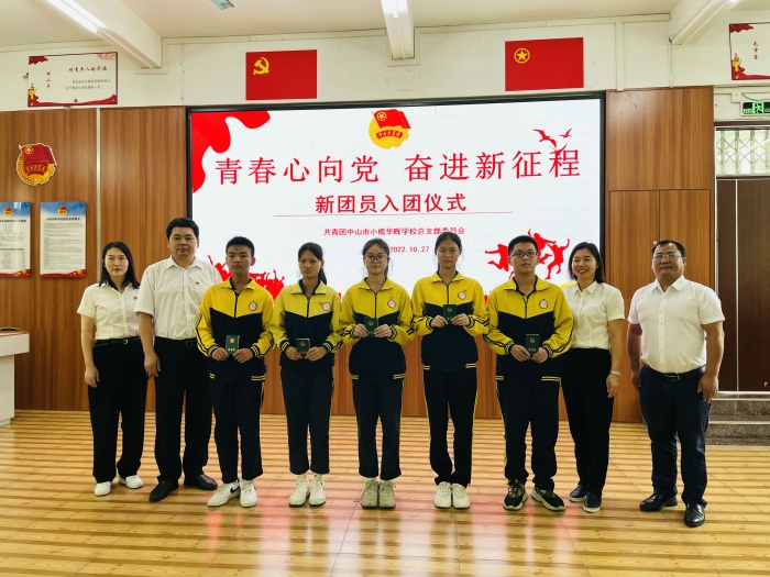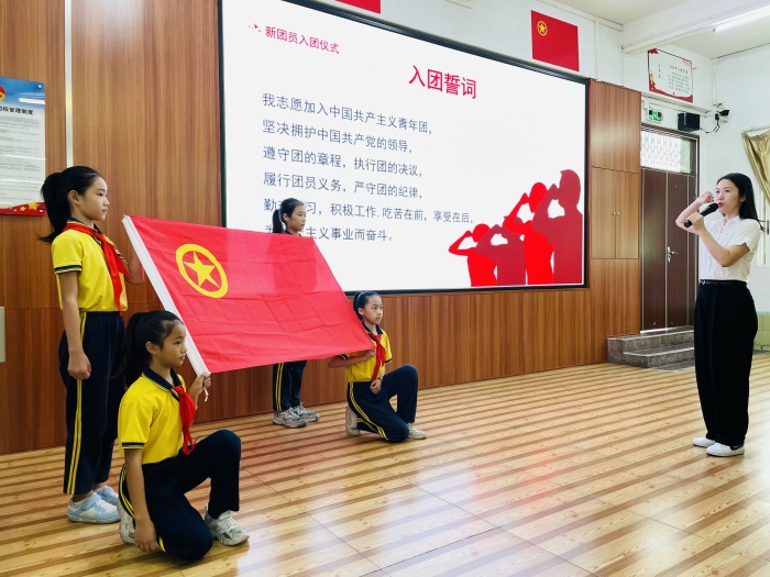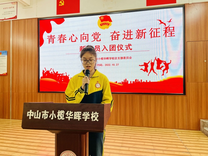 10月27日,中山市小欖華暉學(xué)校在多功能電教室隆重舉行新團(tuán)員入團(tuán)儀式。5名新團(tuán)員面對鮮艷團(tuán)旗,舉起右手莊嚴(yán)宣誓:“我志愿加入中國共產(chǎn)主義青年團(tuán),堅(jiān)決擁護(hù)中國共產(chǎn)黨的領(lǐng)導(dǎo),遵守團(tuán)的章程……為共產(chǎn)主義而奮斗?!?青春誓言、高昂雄渾,表達(dá)了同學(xué)們對共青團(tuán)組織的無限向往和為團(tuán)組織增光添彩的豪邁激情!