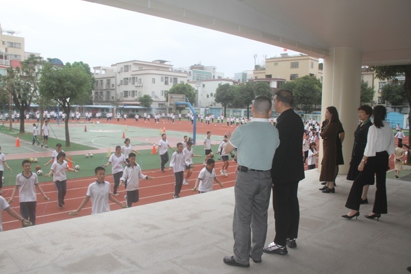 當(dāng)日一早,楓洋中學(xué)同行進(jìn)到小欖一中的校門,即在小欖一中全體行政的陪同下,參觀了學(xué)校的心理輔導(dǎo)室、合唱室、舞蹈室、美術(shù)室、田徑場(chǎng)、文化廊、校史室等功能場(chǎng)室,了解校園環(huán)境,交流校園文化建設(shè)成果與特色。之后,大家一起觀摩學(xué)校師生的大課間活動(dòng)。小欖一中克服校園面積小,運(yùn)動(dòng)場(chǎng)地少等困難,認(rèn)真組織學(xué)生快速到位,精心設(shè)計(jì)跑操、跳繩、籃球、足球等運(yùn)動(dòng),大課間活動(dòng)搞得有聲有色,令楓洋中學(xué)的同行們贊賞有加。