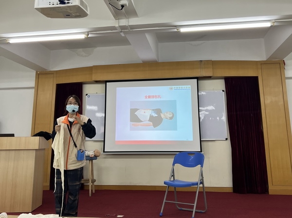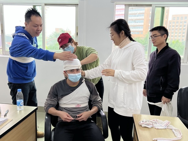 下午,學習的主要內容是氣道異物梗阻急救法和受傷包扎。紅十字會志愿者講師對氣道異物梗阻搶救和如何對傷者進行包扎的內容作了詳細講解;然后,指導大家開展實操活動?!袄碚?體驗”的模式,讓參訓隊員進一步鞏固所學知識,掌握實用急救知識和技能。隊員們認真練習、積極體驗,在之后進行的20道題考試中,都順利過關。經過理論測驗和實操考核,小欖一中的救護隊員們正式成為紅十字救護員。