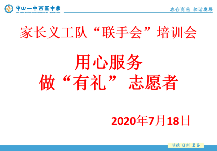 炎炎夏日,中山市創(chuàng)建第六屆全國文明城市工作進入攻堅沖刺階段。為進一步推動中山一中西區(qū)中學家長志愿服務(wù)活動的深入開展,提高志愿服務(wù)整體水平,確保志愿服務(wù)工作在暑假期間的常態(tài)化,打造一支高素質(zhì)的家長志愿者隊伍,7月18日上午及7月22日晚上,學校分年級組織家長志愿者開展主題為“用心服務(wù),做‘有禮’志愿者”的專題培訓。