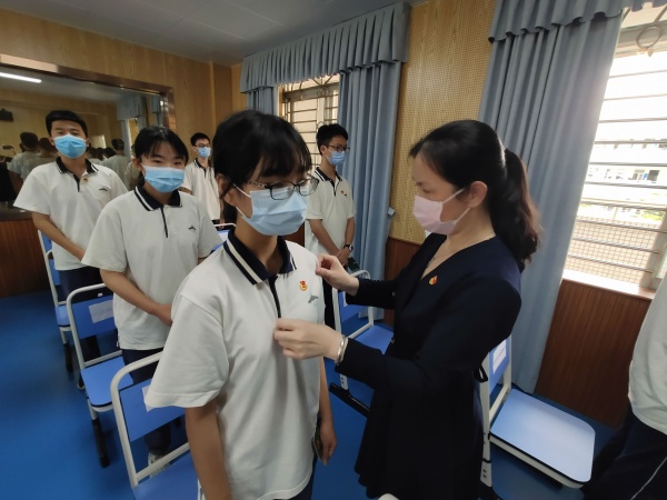 儀式開始,奏唱國(guó)歌。集體入團(tuán)儀式嚴(yán)格按照標(biāo)準(zhǔn)化入團(tuán)流程進(jìn)行,全體新發(fā)展團(tuán)員隔空共同唱響莊嚴(yán)國(guó)歌。隨后莫秀紅副校長(zhǎng)宣讀新團(tuán)員名單,此次入團(tuán)80名同學(xué),他們是通過自主申報(bào)、資格審查、班主任推薦、學(xué)業(yè)成績(jī)考核、團(tuán)校培訓(xùn)考核等綜合考察才獲準(zhǔn)加入中國(guó)共產(chǎn)主義青年團(tuán)的。接著,初三年級(jí)班主任、老團(tuán)員為初三年級(jí)的新團(tuán)員頒發(fā)團(tuán)員證和佩戴團(tuán)徽,初二年級(jí)的新團(tuán)員由家長(zhǎng)頒發(fā)和佩戴,全體團(tuán)員線上同步面向團(tuán)旗進(jìn)行了莊嚴(yán)宣誓。