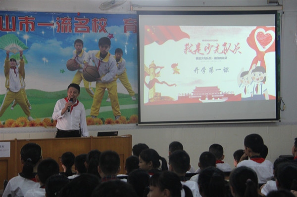 為進(jìn)一步學(xué)習(xí)貫徹“習(xí)近平總書記致第八次全國(guó)少代會(huì)賀信精神”, 2020年9月1日下午14:30,在翠景東方小學(xué)德育處徐海英校長(zhǎng)熱情洋溢的開(kāi)場(chǎng)后,迎來(lái)了雷萬(wàn)兵校長(zhǎng)《我是少先隊(duì)員》的開(kāi)學(xué)第一課,部分師生集中報(bào)告廳觀摩學(xué)習(xí),其余班級(jí)在分會(huì)場(chǎng)舉行。雷校長(zhǎng)耐心細(xì)致,給少先隊(duì)員們一一梳理 “什么是少先隊(duì)”、“隊(duì)旗隊(duì)歌”以及“中國(guó)少年先鋒隊(duì)第八次全國(guó)代表大會(huì)”的思想精髓。少先隊(duì)員是祖國(guó)的花朵,雷校長(zhǎng)鼓勵(lì)廣大少先隊(duì)員要聽(tīng)黨的話,在少先隊(duì)這所大學(xué)校里立志向、修品行、練本領(lǐng),從小培養(yǎng)熱愛(ài)黨、熱愛(ài)祖國(guó)、熱愛(ài)人民的情懷,成為一名合格的少先隊(duì)員。