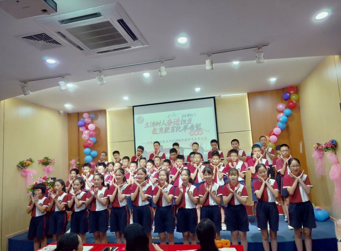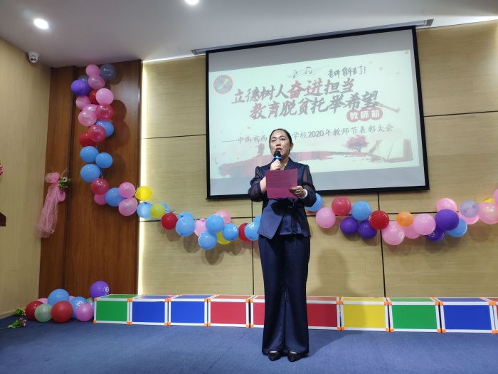 夜幕時(shí)分,華燈初上,聚星學(xué)校階梯室,處處洋溢著節(jié)日的氣氛。由七年級3班鐘欣怡同學(xué)和劉銦子老師主持的教師節(jié)表彰大會如期舉行。孩子們通過“演唱、詩歌朗誦、手語操表演、合唱”等形式,向老師們表達(dá)最真摯的謝意。路海云校長致辭,對辛勤工作的老師表達(dá)了真誠的問候和深深的祝福,勉勵老師們做新時(shí)代的四有教師,繼續(xù)全力以赴,再創(chuàng)佳績。會上,對2019--2020學(xué)年聚星學(xué)校榮獲市區(qū)優(yōu)秀的先進(jìn)個(gè)人,聚星學(xué)校優(yōu)秀科組、優(yōu)秀教師、優(yōu)秀班主任進(jìn)行了表彰。