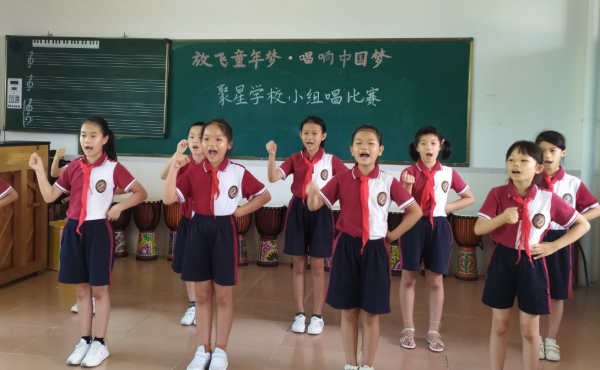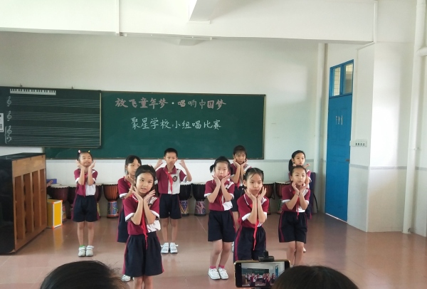 “媽媽教我一支歌,沒有共產(chǎn)黨就沒有新中國,這首歌世世代代永不落”“紅領巾飄呀飄起來,隊旗飄飄放光彩,星星給我夢,火炬給我愛”……2020年6月11日中午,聚星學校音樂室傳出陣陣歌聲,原來是“放飛童年夢,唱響中國夢”小組唱比賽活動正火熱進行中。聚星學校德育副校長張帥以及三位聚星音樂老師擔任本次比賽評委。孩子們用最美的歌喉,用優(yōu)美的旋律、甜美的歌聲唱出對祖國的熱愛,對幸福生活的憧憬。