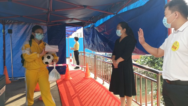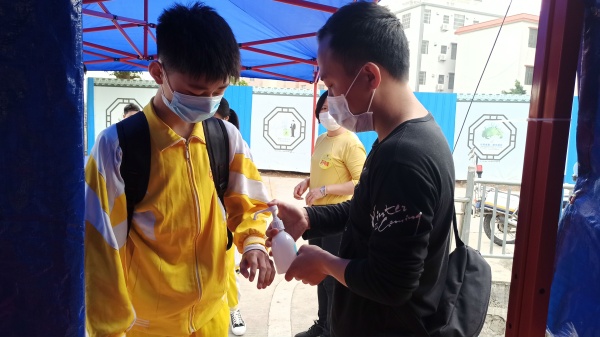 4月27日上午,聚星學校門口早已站著等待孩子們返校的班主任、老師。在聚星學校正門,孩子們根據(jù)老師的要求,有序地排成了間隔一米的隊形,經(jīng)過紅外線測試儀體溫測試、消毒后進入校園。進入校園后,孩子們也不扎堆自覺單行、有條不紊按照要求排隊交健康卡、測量體溫、消毒、到洗手池洗手消毒,排隊上樓進入班級。為了學生進入校園時不產(chǎn)生扎堆的現(xiàn)象,聚星學校實行錯峰上學,讓同學們錯開班級、時間進入校園。