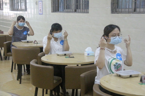 第五場景為午餐、午休, 送餐公司會把午餐配送到教室門口,放學鈴聲一響,正副班主任到班級,副班主任先引導不開餐的同學排隊放學。然后正班主任引導開餐的同學測溫、排隊洗手,洗完手后排隊回課室旁領餐盒,回到指定就餐座位,開始用餐。學生用餐完畢后,把餐盒放在桌面,坐在原座位。反折口罩并裝在左口袋,從右口袋取出口罩換上。排隊把餐具放到指定位置再去洗手消毒。