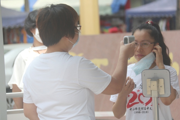 第一場景為師生晨檢管理,設置入校通道標識、隔離樁,學生間隔1米以上有序4列站隊、等候入校,由值勤領導、老師和保安組成護導隊,提醒學生保持安全距離。師生完成體溫檢測以后,前往入校消毒處,排成4條隊伍,前后左右間隔 1 米,有序進行雙手消毒并有序排隊進入校園。實行對在校學生進行一日兩次的健康追蹤,上午入校、下午餐入校分別進行一次健康狀況登記,在校午餐的師生則在各班課室進行測溫。 體溫超過36.8?C的同學跟隨老師去到臨時觀察點進行腋下體溫復查,校醫(yī)進行問診和詢問流行病學史。