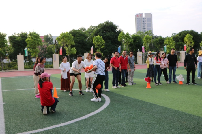 本次活動(dòng)最激烈的要屬“旋風(fēng)跑”了,各個(gè)年級(jí)組的老師們之間配合相當(dāng)默契,五位老師手拉手站成一排,用雙手扶住一根竹竿,從起點(diǎn)出發(fā)繞過標(biāo)志桶再回到起點(diǎn)第二組出發(fā),現(xiàn)場(chǎng)的氣氛瞬間被大家的活力點(diǎn)燃。同呼吸,共命運(yùn),老師們節(jié)奏統(tǒng)一,步伐一致,這不僅是智慧和體力的角逐,還是團(tuán)結(jié)協(xié)作的完美比拼。