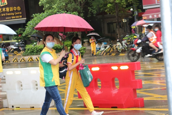 該校從以下“細(xì)節(jié)”支起暖心通道。細(xì)節(jié)一:早上7:00,校門(mén)口支起了一條暖心通道,晨檢準(zhǔn)備工作已經(jīng)部署完畢,天氣預(yù)報(bào)今日有雨,學(xué)校未雨綢繆、細(xì)致安排,早早便搭好寬大的雨蓬、備好充足的雨傘雨衣。細(xì)節(jié)二:拉起引路的紅線,處處可見(jiàn)的路標(biāo)、路牌,以及值日老師們親切的問(wèn)候和指引,讓回歸的學(xué)子們消退迷茫,快速熟悉起昔日校園,為孩子們安全復(fù)學(xué)、有序復(fù)課保駕護(hù)航。細(xì)節(jié)三:初夏雨瀑忽傾,每一位迎接的中心小教師,立即拿起備好的雨傘沖進(jìn)雨中,給孩子們撐起了一片晴空??耧L(fēng)暴雨中大大的傘面微微傾斜,老師們淋濕了半邊身子,卻扶著身旁好久不見(jiàn)的孩子們,欣然微笑,“你若安好便是晴天”。