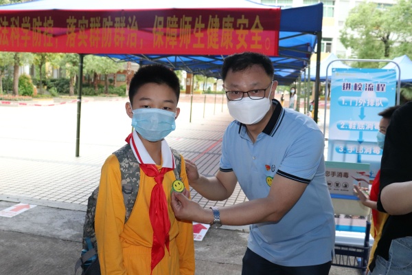 復(fù)學(xué)大禮包:校門(mén)口,同學(xué)們保持1米的安全距離,循著地面的安全線有序站位,經(jīng)過(guò)嚴(yán)格的三道檢測(cè)——鞋底消毒+手部消毒+測(cè)量體溫,就能獲得開(kāi)學(xué)第一件禮物——一枚大大的“笑臉”徽章,“笑臉”后面藏著中心小教師們百日來(lái)數(shù)不盡的思念、溫情、鼓勵(lì)與期許。