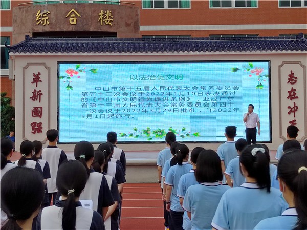 劉莉祥副校長(zhǎng)首先對(duì)《中山市文明行為促進(jìn)條例》進(jìn)行了詳細(xì)解讀,并結(jié)合學(xué)校實(shí)際,對(duì)學(xué)生在校文明行為進(jìn)行了表?yè)P(yáng),并圖文并茂的指出存在的不足,號(hào)召仙中學(xué)子以學(xué)習(xí)《條例》為契機(jī),提高文明素養(yǎng),做文明事,講文明話,爭(zhēng)做文明學(xué)子,共創(chuàng)文明校園,永續(xù)文明中山。