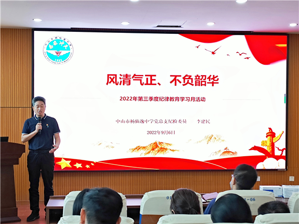 9月6日下午,中山市楊仙逸中學(xué)在綜合樓報(bào)告廳舉行了2022年第三季度紀(jì)律教育學(xué)習(xí)月活動(dòng),黨總支紀(jì)檢委員李建民做了“風(fēng)清氣正、不負(fù)韶華”的專(zhuān)題講座,黨總支書(shū)記、校長(zhǎng)劉朝暉主持專(zhuān)題警示教育,全體黨員和教職員工認(rèn)真參加了學(xué)習(xí)活動(dòng)。