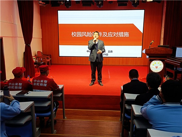 講座就校園風(fēng)險(xiǎn)事件之大類及其應(yīng)對(duì)措施展開安全教育。王森主任將校園風(fēng)險(xiǎn)事件分為以下幾類:社會(huì)治安事件類、突發(fā)公共衛(wèi)生事件類、事故災(zāi)難類、自然災(zāi)害類、影響學(xué)校安全與穩(wěn)定的其他突發(fā)事件。