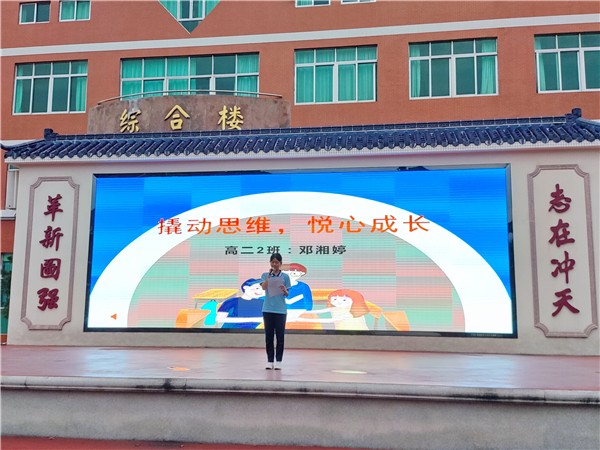 在國旗下講話環(huán)節(jié),高二2班的鄧湘婷同學做了題為《撬動思維 悅心成長》的主題演講。她從心理健康、緩解壓力等方面進行闡釋,并結(jié)合了自身學習生活經(jīng)歷,強調(diào)了撬動思維的重要性,號召大家要注重心理健康,學會撬動思維,塑造健康心理。