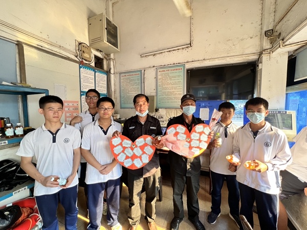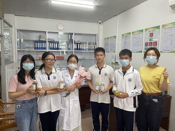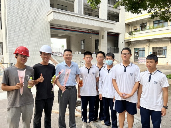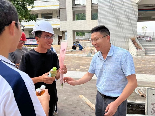 活動(dòng)開始了!集合完畢,準(zhǔn)備出發(fā)。同學(xué)們分成幾個(gè)小隊(duì)來到校醫(yī)辦公室、門衛(wèi)室、校園建筑工地、宿舍辦公室,向所有的后勤老師及工作人員送上祝福。一朵花、一瓶水、一聲祝福,那代表著最真誠的感謝。吳祥明校長(zhǎng)也與同學(xué)們一道,向辛勤的建筑工人們送上鮮花和飲品,代表同學(xué)們感謝他們的辛勤勞動(dòng)。