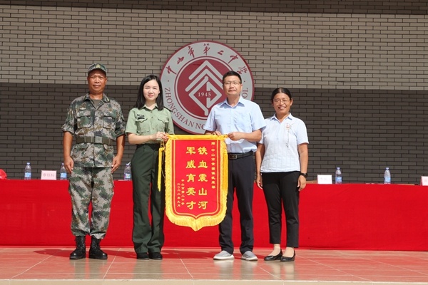 同學(xué)們?nèi)〉玫臉s譽(yù)離不開(kāi)教官的引領(lǐng)和付出,學(xué)校為優(yōu)秀教官們頒獎(jiǎng)。“鐵血震山河,軍威育英才”,為表示對(duì)教官的感謝,吳祥明校長(zhǎng)、梁紅妹副校長(zhǎng)向承訓(xùn)方贈(zèng)送錦旗。