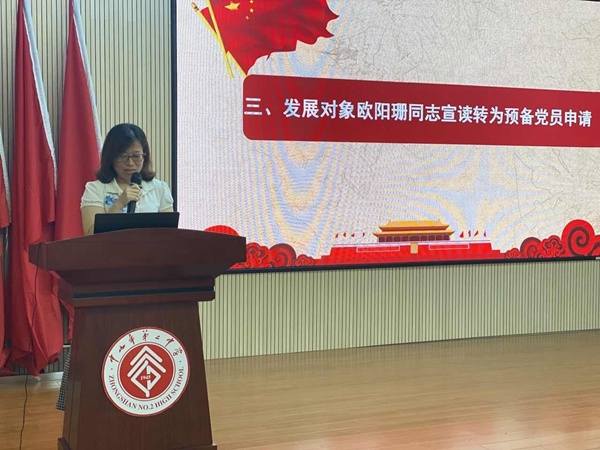 會議第二項,組織委員余心樂介紹歐陽珊同志基本情況和入黨過程,然后歐陽珊同志做思想?yún)R報,宣讀轉(zhuǎn)預備黨員申請書。歐陽珊同志是我們學校優(yōu)秀的語文老師,也是優(yōu)秀的年級德育副主任,她于2020年7月申請入黨,2021年2月確立為入黨積極分子,2022年確立為發(fā)展對象,在此期間,她努力提高自身政治思想水平,從點滴做起,學先進,找差距,不斷向中國共產(chǎn)黨靠近,具備了一名黨員的優(yōu)秀品質(zhì)。
