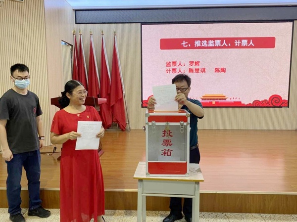 會議第四項,余心樂選讀了支委會的審查意見,大家對是否同意歐陽珊成為預備黨員進行投票,推選出的計票人陳楚琪和陳陶對本次投票進行了統(tǒng)計,監(jiān)票人羅輝宣布出投票結(jié)果:歐陽珊全票通過。
