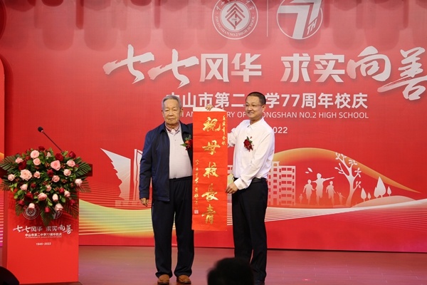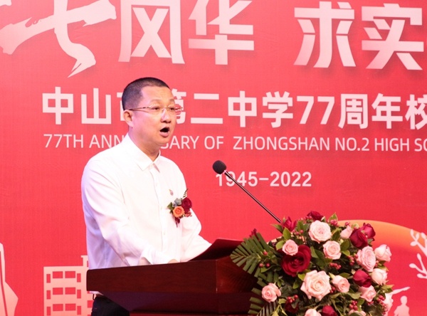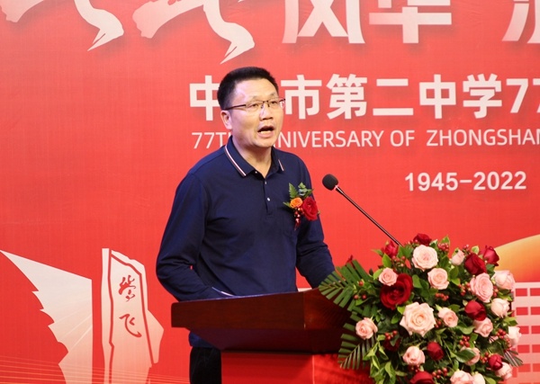 中山市第二中學(xué)老校長(zhǎng)黃棣棠致辭。他說(shuō),中山二中與中山職中和中山市農(nóng)業(yè)技術(shù)中學(xué)等是一脈相承的,它是我們中山市歷史悠久,具有光榮傳統(tǒng)的一間名校,也是培養(yǎng)人才的搖籃。今日應(yīng)牢記習(xí)近平總書(shū)記的殷切教導(dǎo):踔厲奮發(fā),砥礪前行,篤行不怠。使我們中山二中今后有長(zhǎng)足的發(fā)展,創(chuàng)造更大更多的輝煌。