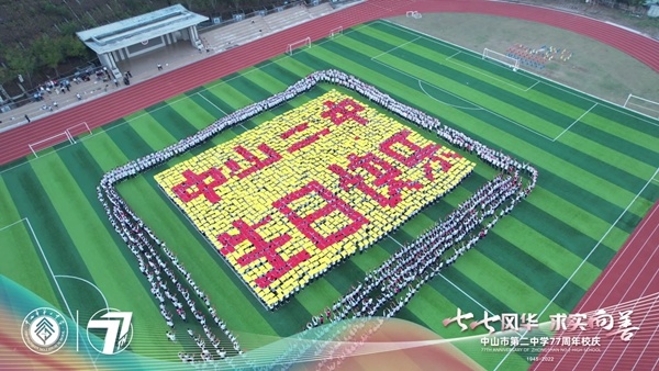 慶典第三章程,啟航。在校教職工與青春活潑的學(xué)子們送上最真的祝福。歷年優(yōu)秀藝術(shù)節(jié)目如一顆顆璀璨的明珠,指引同學(xué)們永不止步。青春在中山二中發(fā)光發(fā)亮,舞動(dòng)飛揚(yáng),全體二中學(xué)子們?cè)诓賵?chǎng)排出對(duì)中山二中的美好祝福:1945,2022,77年,七七風(fēng)華,求實(shí)向善,中山二中,生日快樂(lè)!