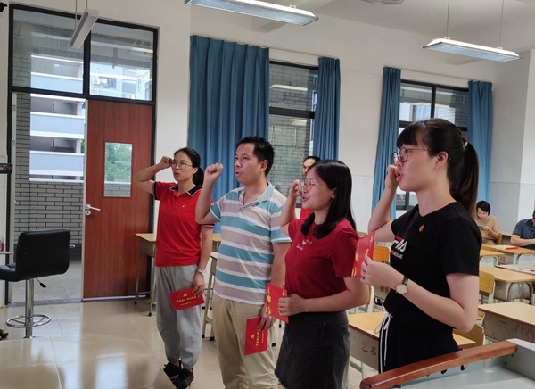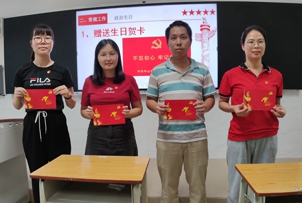 在學習完第一議題后,支部書記楊輝同志對今年以來支部黨員參加“雙聯(lián)雙助”志愿服服活動做了總結(jié),并從新部署了下階段的志愿者服務(wù)工作。他強調(diào),黨員參與疫情防控等“雙聯(lián)雙助”活動是發(fā)揮黨組織的戰(zhàn)斗堡壘作用和黨員先鋒模范作用的主要體現(xiàn)。接著,在楊輝書記的主持下,支部為入黨時間為第三季度的同志吳碧芳、溫朝發(fā)、何蓉、梁莉莉過了一個簡潔而又溫馨的集體生日。楊輝書記為這些同志贈送生日賀卡并帶領(lǐng)他們面對黨旗重溫了入黨宣誓詞。重溫入黨宣誓后,吳碧芳等4位同志發(fā)表了自己一年來的工作匯報和心得。黨員代表談到了一年來的工作收獲和對黨的思想認識,并表示會以本次政治生日為契機,牢記黨員使命,為黨的事業(yè)做出更大的貢獻。最后,全體黨員齊唱《沒有共產(chǎn)黨就沒有新中國》結(jié)束了本次主題黨日活動。