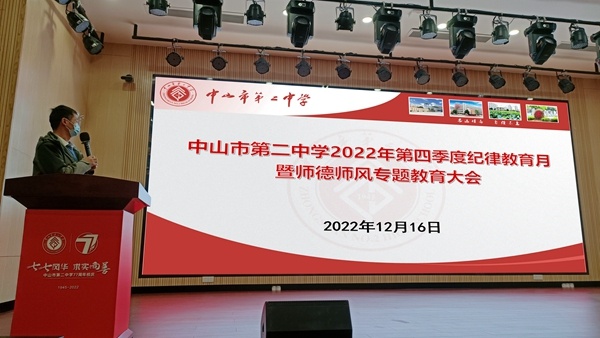 為持續(xù)加強(qiáng)學(xué)校黨風(fēng)廉政建設(shè),筑牢廣大黨員干部和教職工拒腐防變的思想道德防線,引導(dǎo)廣大教職工堅(jiān)定理想信念、強(qiáng)化紀(jì)律意識(shí),以更高標(biāo)準(zhǔn)、更嚴(yán)要求、更實(shí)作風(fēng),在新征程上展現(xiàn)新作為新的教育擔(dān)當(dāng),中山市第二中學(xué)組織開展2022年第四季度紀(jì)律教育月暨師德師風(fēng)教育系列活動(dòng)。