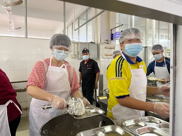 在校長的帶頭示范和唐磊組長的號召下,老師們紛紛報(bào)名參與,不一會兒就馬上滿員。細(xì)化分工,崗前培訓(xùn),注意事項(xiàng)等,唐磊組長每天都重復(fù)著去培訓(xùn)支援食堂的教職工。因此,在每個飯點(diǎn)來臨前,都會有這樣一道風(fēng)景:一支由教職工組成的小隊(duì)伍走進(jìn)食堂協(xié)助。一種無形中的默契形成了,教職工與飯?zhí)脝T工相互配合,大大縮短了學(xué)生等候的時間,也確保了熱乎乎的飯菜能夠更快地在這個冬日里送到學(xué)生的手里。