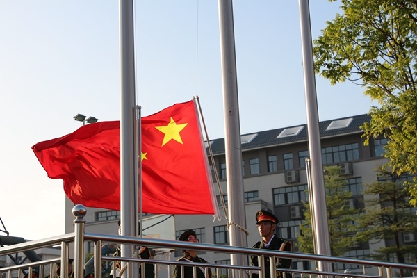 11月14日清晨,中山二中于體育場開展本周升旗儀式,國旗班同學手持國旗,列隊進場。鮮紅的國旗,伴隨著雄壯的國歌聲,升旗儀式莊嚴而神圣。高三9班兩位同學作《七七風華,求實向善!熱烈祝賀中山市第二中學77周年校慶》的國旗下演講。