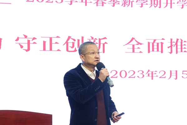 王曙東校長提到,我們要珍惜成果,感恩奮進,激勵全體教師在新的學年,從“善”出發(fā),守正創(chuàng)新。在2023年度,學校黨委確定學校工作重點為——教育高質(zhì)量發(fā)展。高質(zhì)量發(fā)展的學校到底什么樣?王曙東校長指出高質(zhì)量發(fā)展的學校應包含“五有”:有人、有貌、有神、有力、有名。王曙東校長號召全校上下圍繞“十四五”規(guī)劃和2035年遠景目標綱要中建設高質(zhì)量教育體系這一未來教育發(fā)展目標,在新一年工作中起好步,開好局,開創(chuàng)新作為。