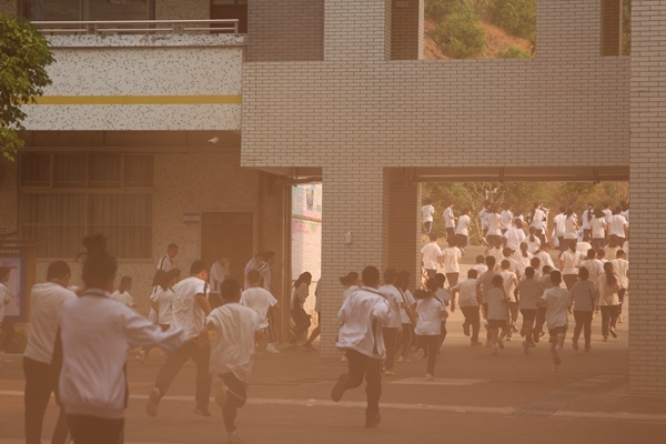 上午8點50分,第一、二、三教學樓煙霧彈點燃,隨著煙霧逐漸濃烈,火災警報響起,各行政立即到達指定崗位,引導學生快速疏散,全體學生在老師的有序指導下,用手捂著鼻子,躬著身,扶著墻腳,保持著安全距離,按照規(guī)劃的逃生路線,快速地從班級撤離,到達體育場集合。各班班主任迅速清點人數(shù)。
