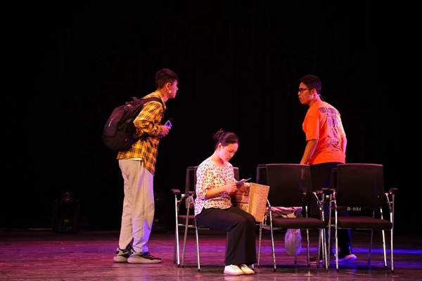 本次比賽劇目由魏媛老師選題并指導,魏老師對劇本反復斟酌并修改,合理分配角色,組織參演的學生利用課余時間積極參與排練。 本次參演的同學有楊歡歡、 王潔欣 、李其佑、勞妮娜、戴境、侯芮、黃樂兒等同學。為了在比賽時能夠呈現(xiàn)出最出色的狀態(tài),師生們抓緊時間,在出發(fā)前進行校內(nèi)排練。