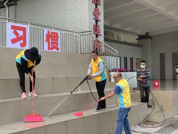 隨后,各支部各黨員志愿者秒變“鐵道游擊隊(duì)”“叢林英雄”“沖鋒衛(wèi)士”,開展“文明典范城市,推動中山高質(zhì)量發(fā)展——中山市第二中學(xué)在行動”志愿服務(wù)活動。第一支部全體黨員對校園宣傳欄、花基、樹基、草坪等衛(wèi)生死角、盲區(qū)進(jìn)行清除,全域、全方位提升校園環(huán)境品質(zhì)。第二黨支部對全校各個區(qū)域的下水道進(jìn)行衛(wèi)生清掃,全體黨員干部紛紛拿起手套、掃帚、鏟子等工具,撿拾、清理下水道垃圾、樹葉。第三黨支部圍繞校園里圖書館區(qū)域與第三教學(xué)樓的相關(guān)區(qū)域的一些衛(wèi)生死角開展衛(wèi)生清潔和整理。各位黨員同志們身著黃馬褂,精神飽滿、熱情高漲,手持掃帚、拖把,鐵鍬等清潔工具,走進(jìn)相關(guān)負(fù)責(zé)區(qū)域進(jìn)行環(huán)境衛(wèi)生大掃除,清理樓道雜物、清理衛(wèi)生死角,用實(shí)際行動弘揚(yáng)雷鋒精神。經(jīng)過一個多小時的奮斗,各小組負(fù)責(zé)的區(qū)域衛(wèi)生面貌得到極大改善。第四黨支部負(fù)責(zé)學(xué)校運(yùn)動場及周邊區(qū)域。黨委書記王曙東同志帶頭示范,拎著垃圾桶圍繞學(xué)校操場,不放過一個角落地進(jìn)行垃圾分類回收。見到操場看臺需要清理,王曙東同志挽起袖子褲腿接過水槍,一層一層地清理。第四支部的黨員同志干勁足,積極性高,有的同志清理排水溝,垃圾堵住了出水口,就親自用手去清理排水溝的垃圾,不怕苦、不怕臟;有的同志擦欄桿,有的同志拖地,有的同志耐心地一個一個地擺好足球框,有的同志用沙耙清理沙池雜物垃圾。在滾滾的煙塵中,同志們不怕辛勞,弘揚(yáng)雷鋒精神,打掃好清潔好整理好自己的區(qū)域,用自己的實(shí)際行動,創(chuàng)造一個整潔優(yōu)美的校園環(huán)境。