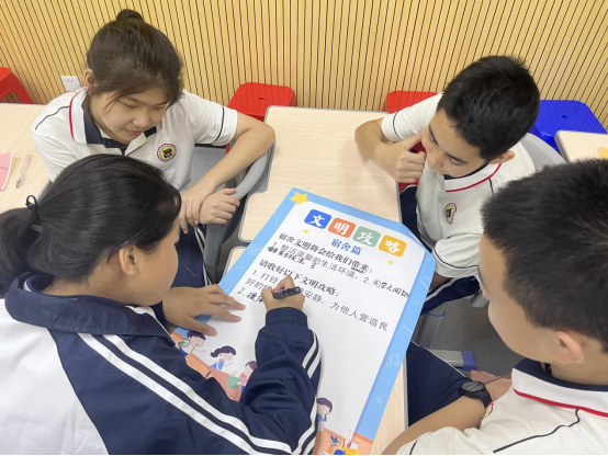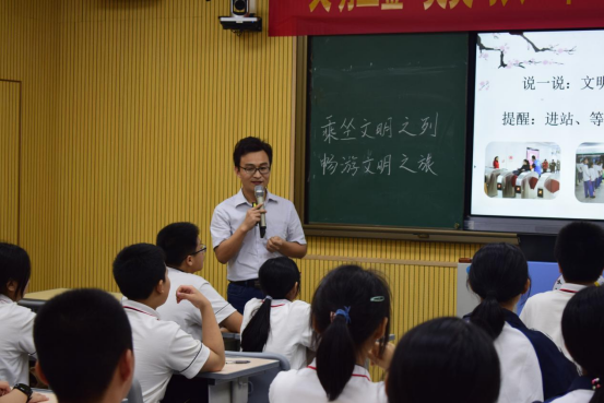 本次主題班會課采用市級班會課比賽形式,五位參賽班主任都是借班上課,更加考驗班主任組織管控能力。比賽現(xiàn)場精彩紛呈。我校梁瑋老師的課堂設(shè)計新穎獨特,通過新聞案例、課堂游戲等,引領(lǐng)同學(xué)們做文明使者,傳播真善美,把中華文明發(fā)揚光大。南僑英才學(xué)校的羅小珠老師以同學(xué)們最熟悉的宿舍生活作為討論重點,教育引導(dǎo)同學(xué)們在宿舍生活中要積極踐行文明公約,做文明中學(xué)生。我校李泓锫老師的班會課學(xué)科融合性很強,她以說文解字的方式帶領(lǐng)同學(xué)們一起探究“文明”的深刻含義,教育同學(xué)們內(nèi)化于心、外化于行,真正做到文明修身。南僑英才學(xué)校的畢紅昌老師在課堂設(shè)計中引入中山熱門話題“中山也有地鐵了”,帶著第一批僑中小旅客,感受生態(tài)文明,贊嘆國家的發(fā)展,傳承文明,祝愿祖國越來越好。我校陳盼盼老師則從初一學(xué)生的文明習(xí)慣導(dǎo)入主題,設(shè)置情景,讓同學(xué)們設(shè)身處地去辨別“文明”與“不文明”行為,引導(dǎo)同學(xué)們自覺規(guī)范個人行為,不斷提升個人素養(yǎng),爭做文明公民,樹立文明新風(fēng)。