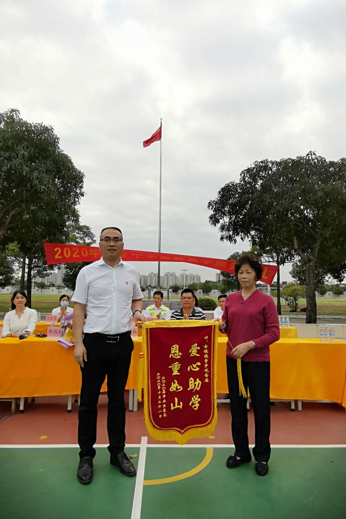 典禮伊始,由校民樂團(tuán)一首古箏重奏《豐收鑼鼓》拉開典禮的序幕。接著,年四揚(yáng)校長(zhǎng)致歡迎辭,他感謝曹步聯(lián)隊(duì)、曹步觀音廟對(duì)學(xué)校工作的大力支持,表示定會(huì)砥礪前行,再創(chuàng)輝煌。在場(chǎng)的師生、家長(zhǎng)奏唱國歌,齊做手語操。之后,觀音廟代表梁悅卿女士發(fā)言。梁女士總結(jié)了曹步中學(xué)的成績(jī),表揚(yáng)了優(yōu)秀的畢業(yè)生,鼓舞在校學(xué)生穩(wěn)步前進(jìn)、尊師重道,祝愿同學(xué)們?cè)佾@佳績(jī)。發(fā)言完畢,學(xué)生代表獻(xiàn)花,年校長(zhǎng)代表學(xué)?;刭?zèng)錦旗。接著,由梁月卿女士、年四揚(yáng)校長(zhǎng)、李學(xué)軍副校長(zhǎng)、吳文杰副校長(zhǎng)四位頒獎(jiǎng)嘉賓為優(yōu)秀學(xué)生家長(zhǎng)頒發(fā)優(yōu)秀學(xué)生獎(jiǎng)。