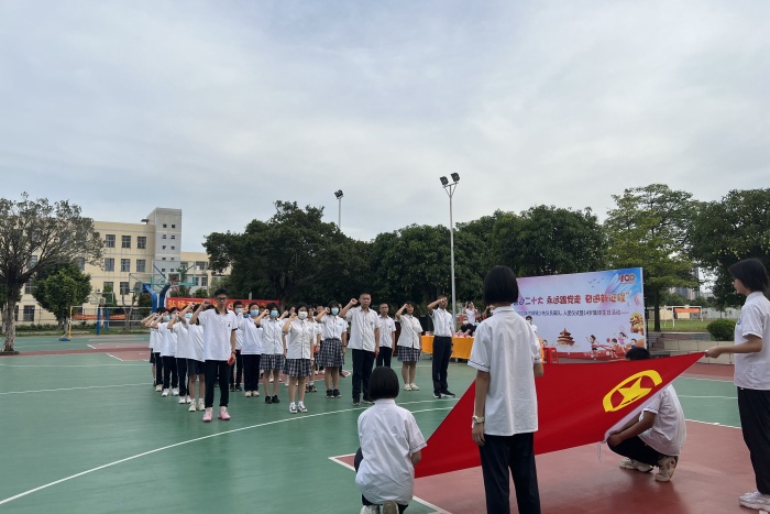 喜迎黨的二十大,結(jié)合慶祝中國(guó)共青團(tuán)成立100周年,不斷深化學(xué)習(xí)貫徹習(xí)近平新時(shí)代中國(guó)特色社會(huì)主義思想,用黨的創(chuàng)新理論武裝全團(tuán)。2022年5月30日,由古鎮(zhèn)鎮(zhèn)團(tuán)委、少工委、中山市曹步初級(jí)中學(xué)黨委、團(tuán)委、少工委承辦的“喜迎二十大 永遠(yuǎn)跟黨走 奮進(jìn)新征程”——古鎮(zhèn)鎮(zhèn)少先隊(duì)員離隊(duì)、入團(tuán)儀式暨14歲集體生日活動(dòng)于曹步初級(jí)中學(xué)舉行。鎮(zhèn)團(tuán)委書(shū)記曹嘉銘、鎮(zhèn)教體中心廖秋菊、曹步中學(xué)校長(zhǎng)年四揚(yáng)、鎮(zhèn)團(tuán)委副書(shū)記張慧慧、曹中副校長(zhǎng)吳文杰、曹中德育主任鄧妃弟、曹步中學(xué)團(tuán)委書(shū)記詹廣權(quán)、古鎮(zhèn)中學(xué)團(tuán)委書(shū)記嚴(yán)海英、海洲中學(xué)團(tuán)委書(shū)記袁錦釗、光正學(xué)校團(tuán)委書(shū)記區(qū)根成出席活動(dòng)。