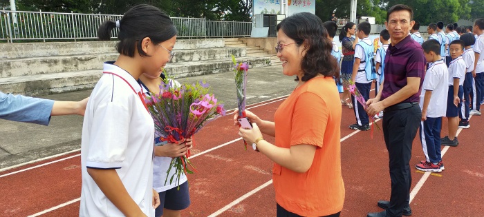 在莊嚴(yán)肅穆的升旗儀式過(guò)后,慶祝第36個(gè)教師節(jié)暨頒獎(jiǎng)典禮正式開(kāi)始。頒獎(jiǎng)典禮上,在劉木勛主任的主持下,全體善雅學(xué)子們滿懷深情的喊一聲:老師,祝您節(jié)日快樂(lè)!在這個(gè)特殊節(jié)日里,學(xué)生們真摯的祝福就是對(duì)老師們最深情的告白。接著,在全校師生熱烈的掌聲中和注目下,“最美年級(jí)、最美備課組、最美備課組長(zhǎng)、最美教學(xué)能手、最美班主任”的教師獲得者分批走上主席臺(tái),接受劉喜全校長(zhǎng)頒發(fā)的榮譽(yù)證書(shū)以及學(xué)生代表送上的鮮花。與此同時(shí),臺(tái)下的同學(xué)們?cè)缫哑炔患按慕o老師們獻(xiàn)上自制手工藝品、寫(xiě)滿祝福的賀卡、鮮花等小禮物表達(dá)對(duì)老師的感謝和祝福,每一份禮物和祝福都飽含著學(xué)生對(duì)老師深深的愛(ài)。在一聲聲“祝老師節(jié)日快樂(lè)”“老師,您辛苦了!”的節(jié)日祝福中,老師們接過(guò)鮮花、小禮物,臉上掛滿了幸福的笑容。學(xué)生的心意讓這個(gè)屬于老師們自己的節(jié)日變得更加絢麗,整個(gè)校園頓時(shí)洋溢在尊師重教、感恩的歡樂(lè)海洋之中。