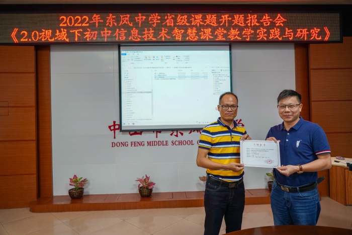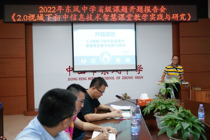 為了促進(jìn)信息技術(shù)與教育教學(xué)融合創(chuàng)新發(fā)展,推動(dòng)學(xué)校的信息化教學(xué)模式從多技術(shù)型走向智慧型,東鳳中學(xué)邱亞輝老師成功申報(bào)了2022年廣東省中小學(xué)教師信息技術(shù)應(yīng)用能力提升工程2.0專(zhuān)項(xiàng)科研課題“2.0視域下初中信息技術(shù)智慧課堂教學(xué)實(shí)踐與研究”。7月7日下午,該項(xiàng)課題在東鳳中學(xué)會(huì)議室進(jìn)行了開(kāi)題報(bào)告會(huì)。出席報(bào)告會(huì)的有:中山市能力提升工程2.0辦公室吳寒冬主任,教育部國(guó)培計(jì)劃專(zhuān)家、廣東省特級(jí)教師、市教研室信息技術(shù)教研員陳明宏老師,市教育技術(shù)中心陳志豪老師以及課題組的全體人員。