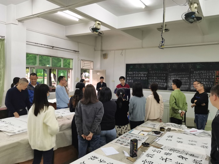 硬筆字、軟筆字、粉筆字是教師基本功之一。3月25日下午4點(diǎn)35分,港口中學(xué)近三年入職新教師“三筆字”技能比賽在學(xué)校書法室順利舉行。本次大賽由學(xué)校教務(wù)處、學(xué)校書法室聯(lián)合舉辦,大賽邀請(qǐng)到了吳可平、李超、林偉、何中慶、譚金華、梁用戰(zhàn)等老師擔(dān)任此次比賽的評(píng)委。十六位新教師,各展風(fēng)采,共同為大家展示了一場(chǎng)書法藝術(shù)的魅力。大賽持續(xù)了近一個(gè)小時(shí),采用現(xiàn)場(chǎng)書寫現(xiàn)場(chǎng)評(píng)分的方式進(jìn)行,吸引了學(xué)校其他老師前來(lái)觀摩。
