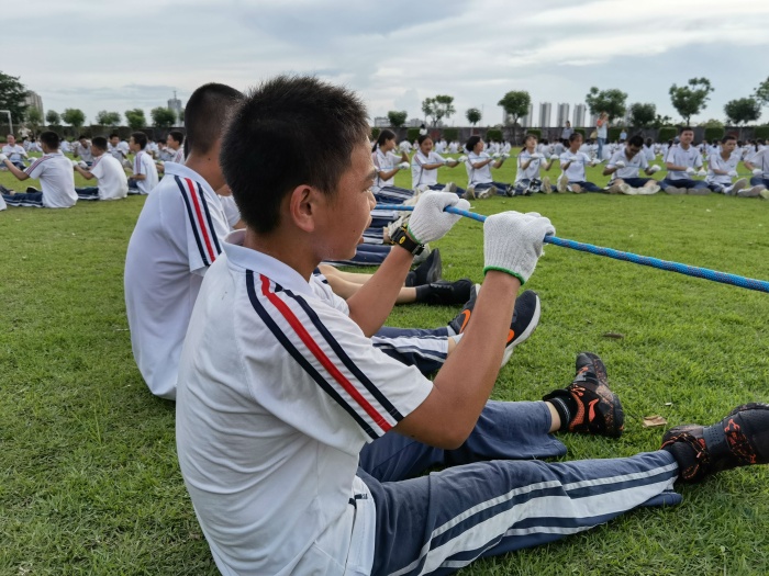 接下來進(jìn)行的是信任動(dòng)力繩。這個(gè)游戲要求所有人手握繩圍成圈,雙腳合并,用腳后跟著地,同時(shí)向后倒。一個(gè)同學(xué)在繩子上走,另外兩個(gè)同學(xué)分別在內(nèi)圈和外圈保護(hù)走繩子的同學(xué),走的過程中不能掉下來,否則要重新開始,十分鐘內(nèi)走完繩子人數(shù)最多的班級(jí)勝出。比賽伊始,同學(xué)們互相嬉鬧,但很快就有同學(xué)提出要相互團(tuán)結(jié),相互協(xié)助方能成功。在大家的齊心協(xié)力下,同學(xué)們都能順利地繞繩子走完一圈。整個(gè)過程中,同學(xué)們的笑聲和鼓勵(lì)聲回蕩在足球場(chǎng)上,每個(gè)人都在充分享受比賽帶來的興奮和快樂,把平時(shí)學(xué)習(xí)生活中的煩惱和壓力都徹底釋放了出來。